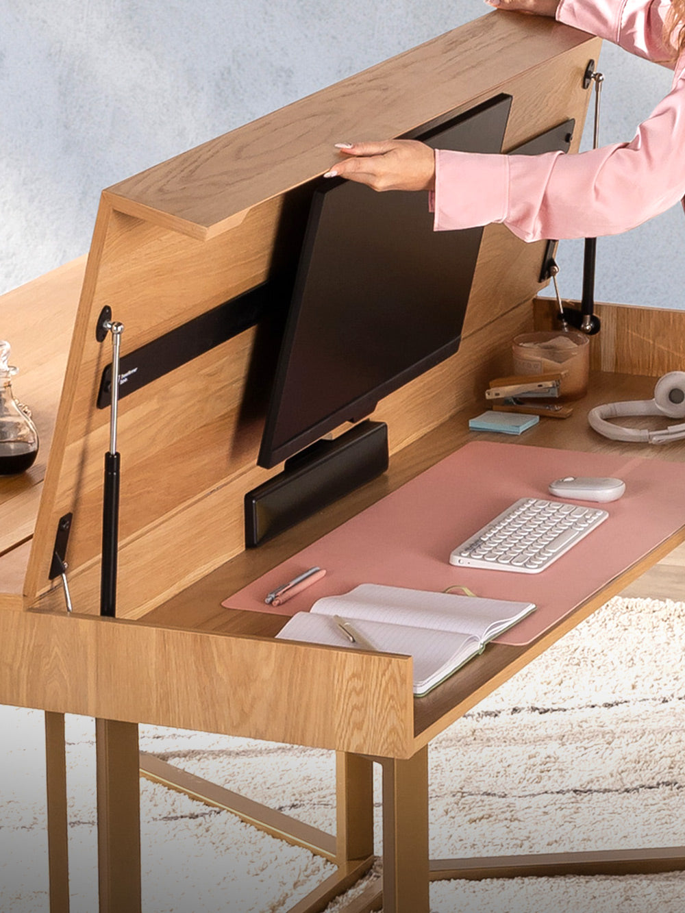 Seamlessly switch from 9-5 to 5-9, with the dining table that becomes two desks. Complete with integrated storage and cable management so work from home doesn't interfere with life at home.