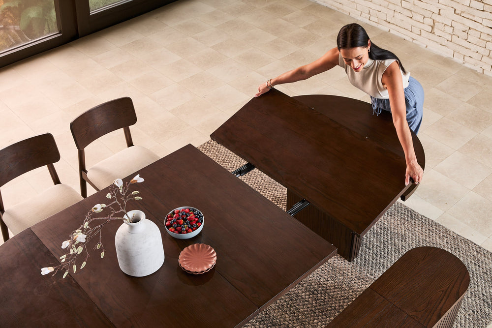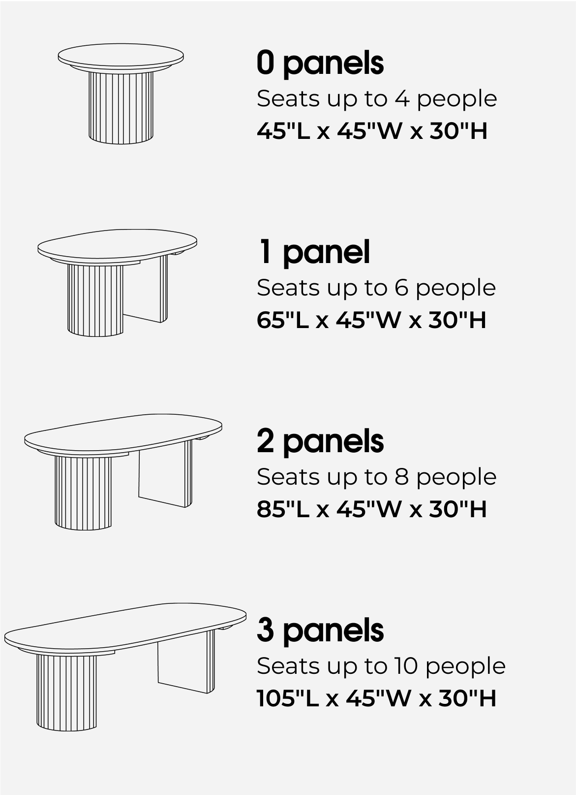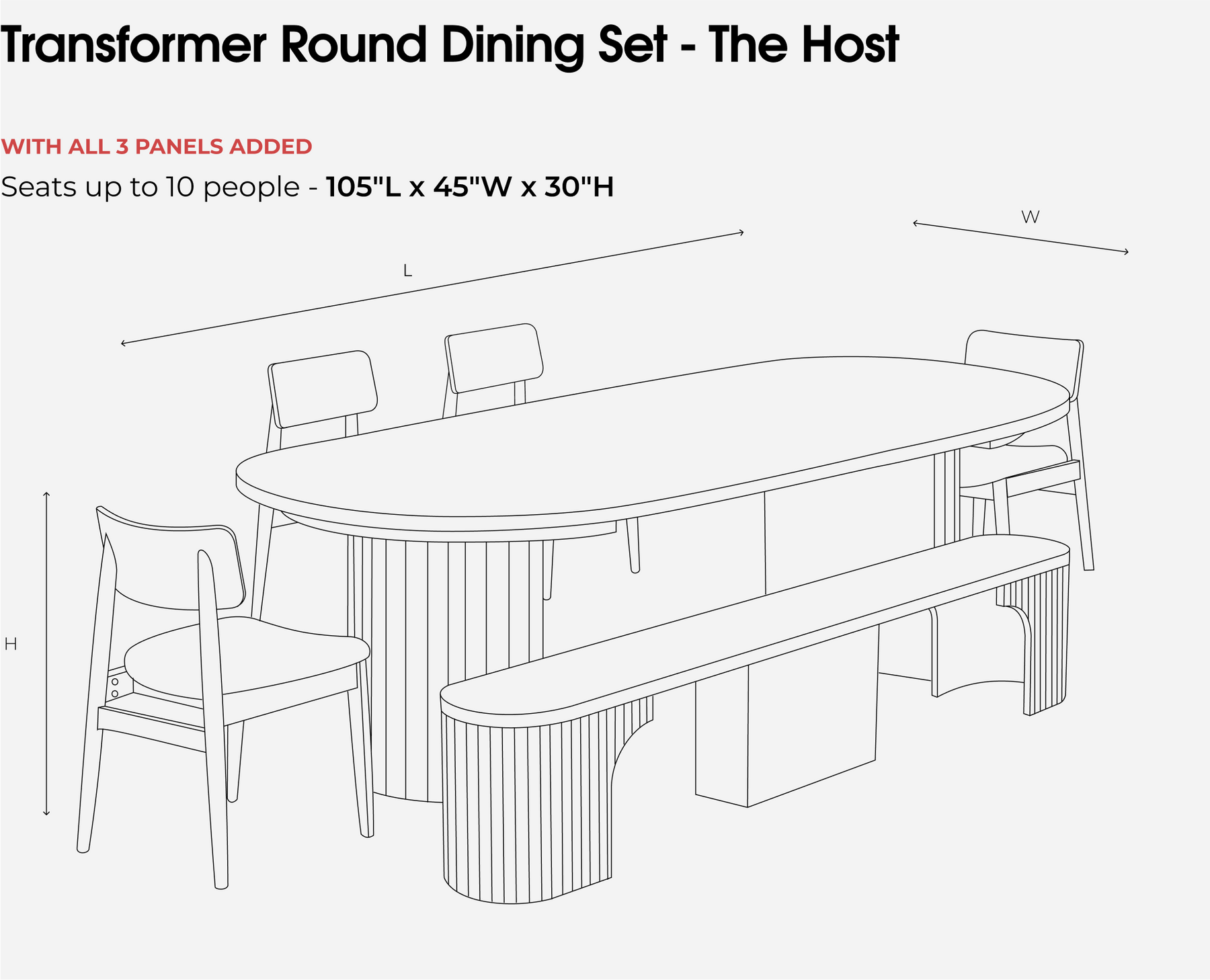 Easily transforms from a round to an oval table to seat between 4 and 10 people.